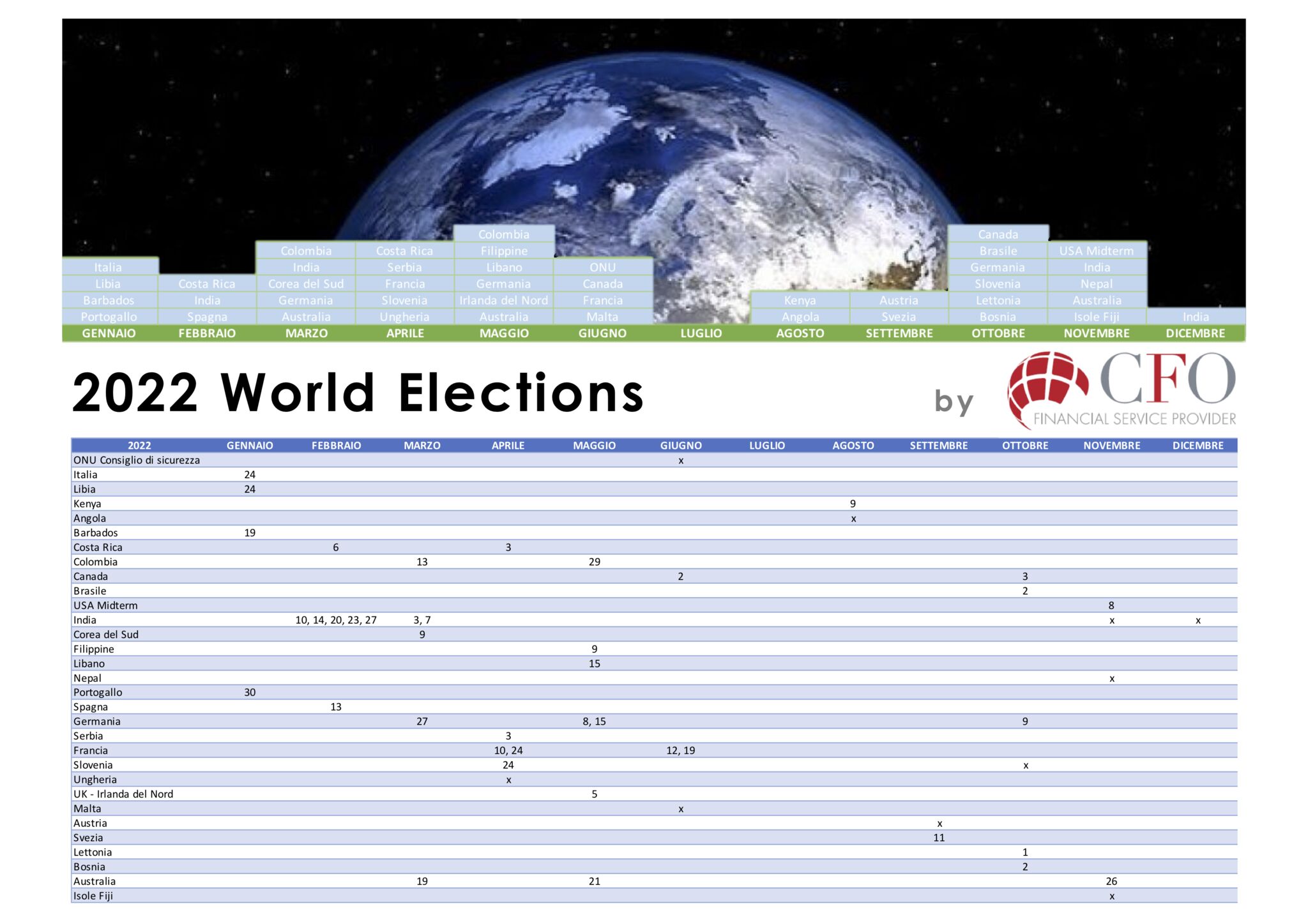 Elezioni 2022? Non solo il #presidentedellarepubblica italiana. Altri 29 paesi vedono passaggi elettorali importanti, senza considerare il rinnovo di 5 membri non permanenti del Consiglio di Sicurezza dell’ONU e non considerando le tornate amministrative che solo in Italia vedono 1.000 comuni coinvolti.